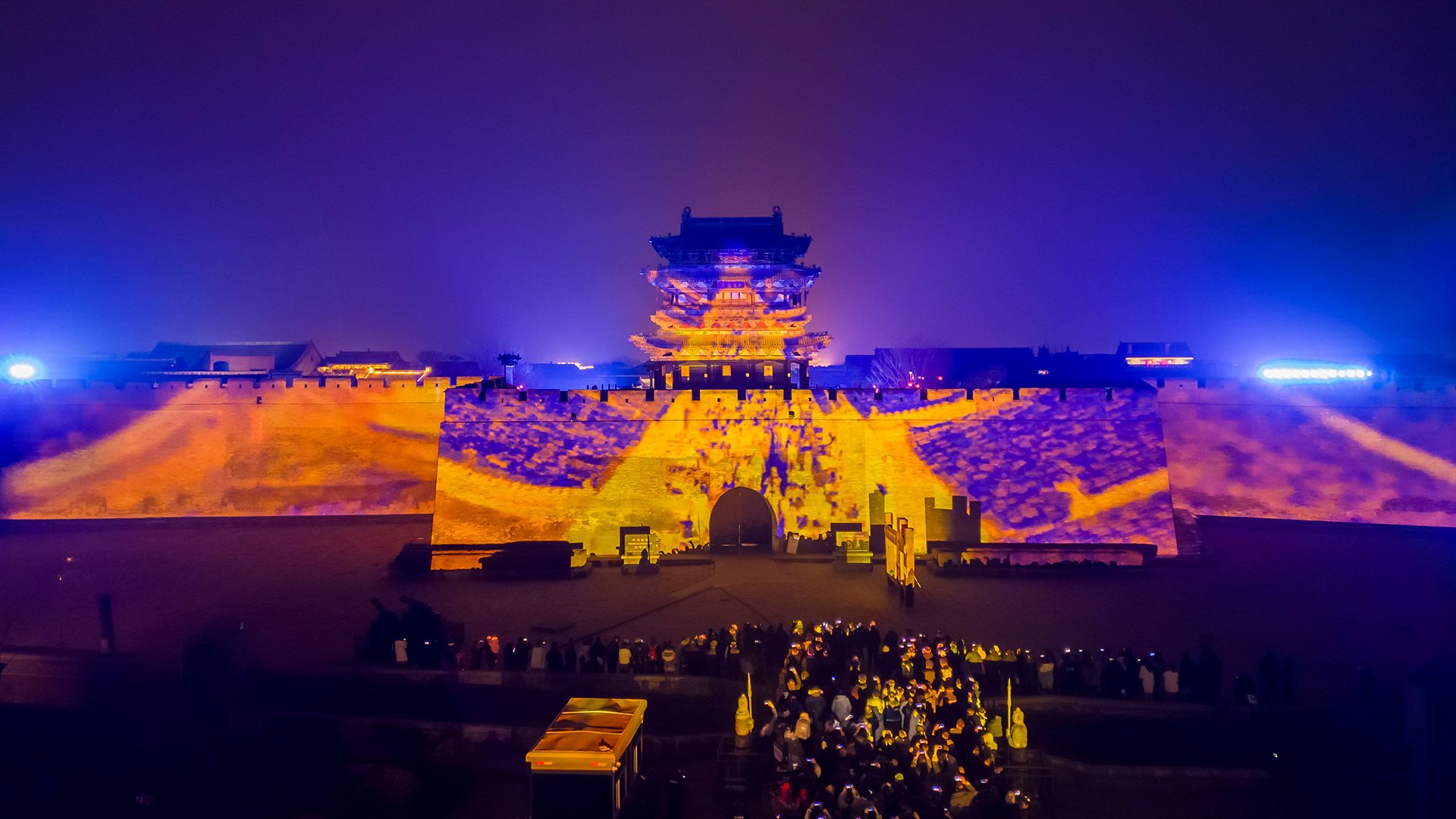 古城夜宴,光影流转映城楼,流光溢彩醉游人