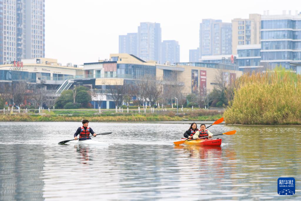 早春时节,一堂水上运动公开课在浙江省宁波市江北区甬江街道星湖公园进行。青年学员们划着皮划艇、桨板,在教练员指导下泛舟湖面,享受水上运动的乐趣。