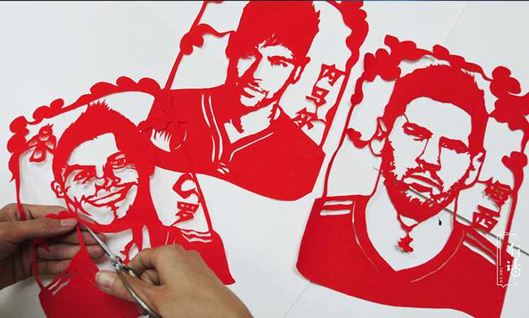 我之前剪過的民俗剪紙作品,像《白蛇傳》、《七月七鵲橋會》、《夜哭郎》等等,這些題材承載的是我們的傳統(tǒng)。但這些較為傳統(tǒng)的剪紙受眾并不多,所以我認為青年人要有新的創(chuàng)新,加入現(xiàn)代社會中許多時尚前衛(wèi)的元素,這樣才能獲得更多人的喜愛。在2014年世界杯的時候,我就試著剪“世界杯剪紙”,梅西、C羅、內(nèi)馬爾,讓一些球星躍然紙上,讓熱愛足球的年輕人去關(guān)注、了解到傳統(tǒng)的剪紙藝術(shù)。2015年是世界反法西斯戰(zhàn)爭勝利70周年,我看到關(guān)于戰(zhàn)爭的一些資料圖片后,就創(chuàng)作了一幅《南京大屠殺》剪紙。畫面中運用了黃色、紅色、黑色表現(xiàn)土地、火焰還有憤怒,這些都是用剪紙來表達我心中的感受。我的工作室現(xiàn)在也會做一些時尚的婚紗照剪紙,還有生日剪紙等,把這些傳統(tǒng)吉祥的寓意融入到現(xiàn)代人們的需求、裝飾和禮物中。
