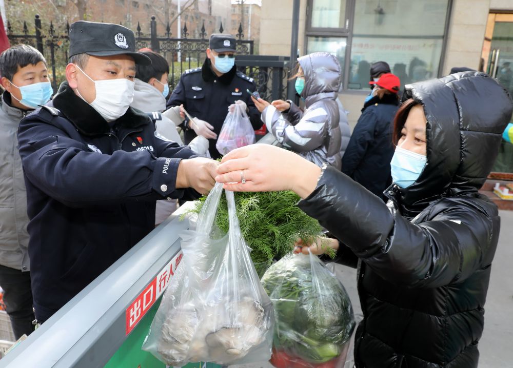 ↑ 1月10日,在石家莊市橋西區(qū)東風北路社區(qū),民警在協助蔬菜配送員為居民配送蔬菜。