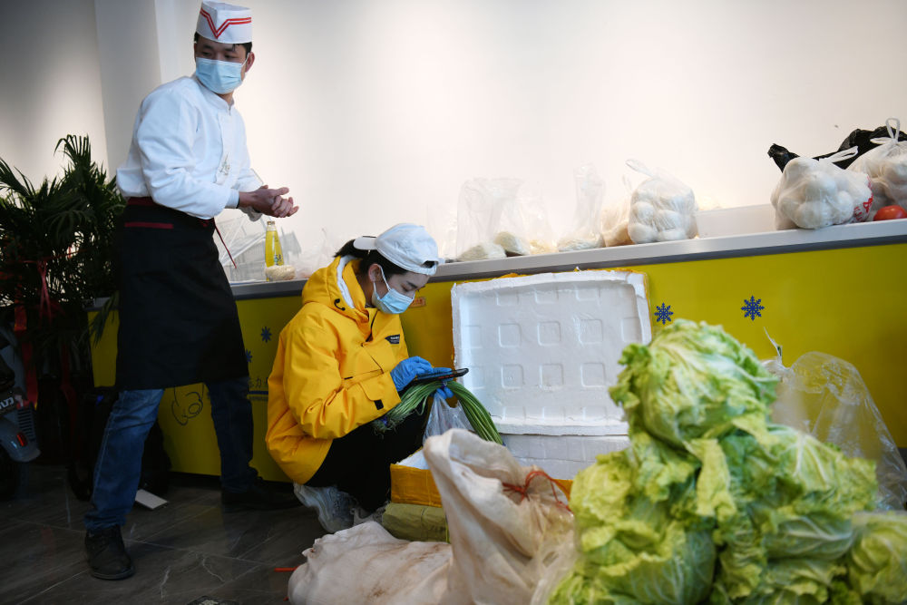 ↑1月11日,汪新建(左)和張琪琪夫婦在準備給鄰居們送菜。生活在河北石家莊市玉蘭苑小區(qū)的夫婦二人,在小區(qū)門口開了一家餐廳,夫妻倆帶著廚師和司機,為社區(qū)的工作人員免費提供盒飯,義務給鄰居們跑腿買菜。