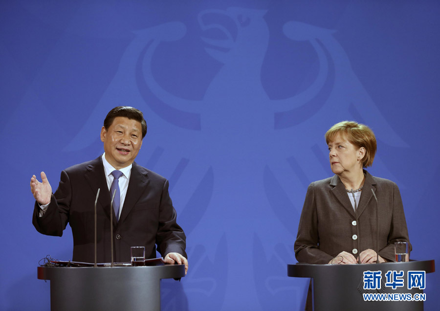 3月28日,國(guó)家主席習(xí)近平在柏林與德國(guó)總理默克爾共同會(huì)見(jiàn)記者。 新華社記者 蘭紅光 攝