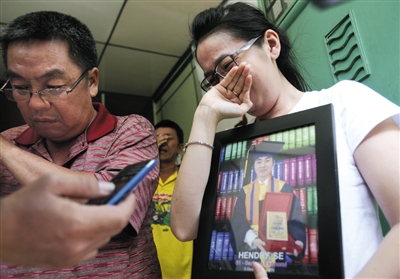 18日,一名印尼乘客的家屬在接受媒體采訪時痛哭。