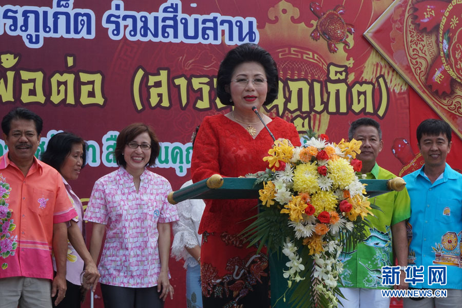 ????8月12日,泰國普吉府舉辦中國傳統(tǒng)的“中元普渡”活動,以普渡孤魂,表達仁愛和孝道思想。該活動在普吉已有150多年的歷史,每逢中國農歷7月,當地華人便會舉行祭祀儀式,用面粉和糖制成大小不一的紅色面團,裝飾成烏龜形狀,既表達了對于祖先的懷念,還傳遞了對于全家人健康長壽的祝福。圖為普吉府普吉市市長頌齋(中)在活動開幕式上。新華網記者 楊云燕 攝