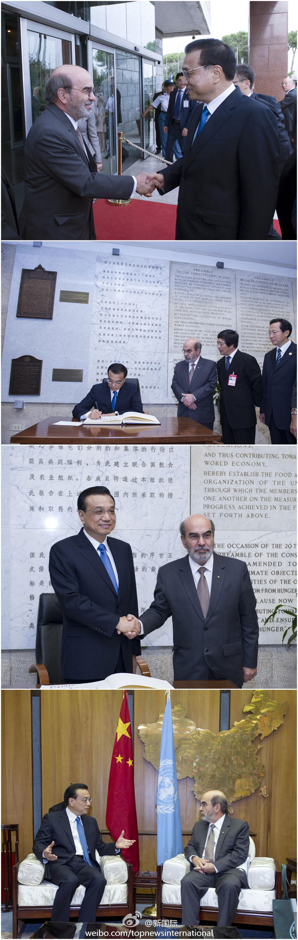 ????新華網(wǎng)北京10月15日電 據(jù)新華社“新國(guó)際”微博報(bào)道,應(yīng)聯(lián)合國(guó)糧農(nóng)組織總干事格拉齊亞諾的邀請(qǐng),李克強(qiáng)總理在世界糧食日前夕,來到位于羅馬的糧農(nóng)組織總部訪問,與格拉齊亞諾會(huì)見并發(fā)表演講。這是李克強(qiáng)就任總理后首訪聯(lián)合國(guó)組織,也是中國(guó)總理首次訪問糧農(nóng)組織總部。