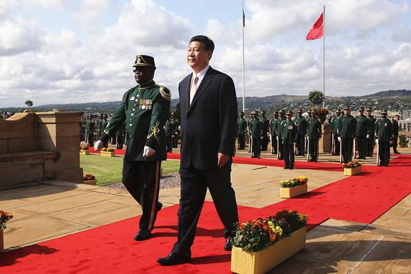 2013年3月26日,南非總統(tǒng)祖馬在比勒陀利亞聯(lián)邦大廈前廣場(chǎng)舉行儀式,歡迎中國(guó)國(guó)家主席習(xí)近平訪問(wèn)南非。( 新華社記者蘭紅光攝)