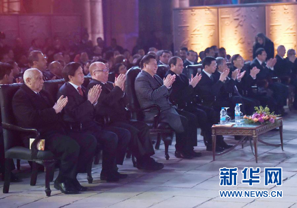 1月21日,國家主席習(xí)近平和埃及總統(tǒng)塞西在古老的盧克索神廟廣場共同出席中埃建交60周年慶?;顒?dòng)暨2016中埃文化年開幕式。新華社記者張鐸攝