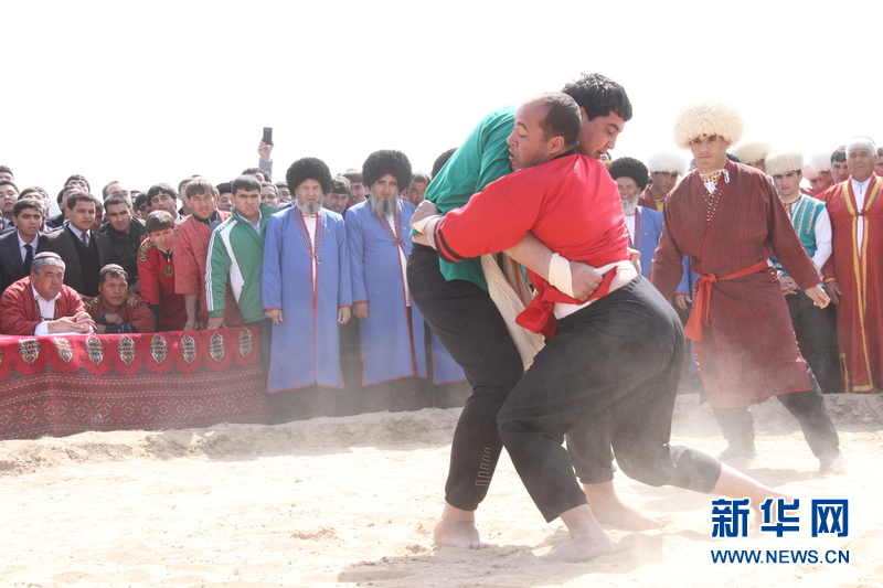 3月21日,在土庫曼斯坦首都阿什哈巴德,現(xiàn)場(chǎng)進(jìn)行摔跤比賽。新華社記者盧敬利 攝
