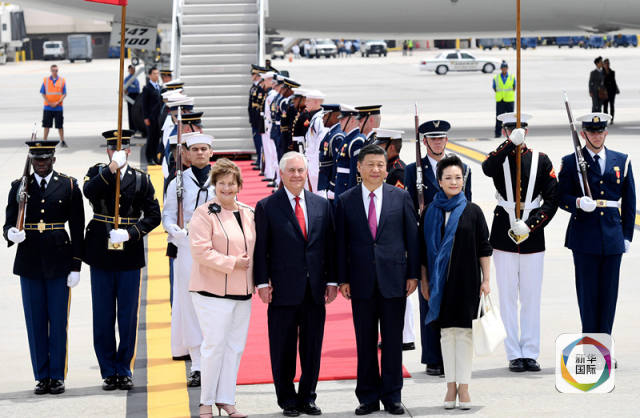 4月6日,國家主席習近平乘專機抵達美國佛羅里達州,將在海湖莊園同美國總統(tǒng)特朗普舉行中美元首會晤。習近平和夫人彭麗媛受到美國國務卿蒂勒森夫婦等熱情迎接。(新華社記者吳曉凌攝)