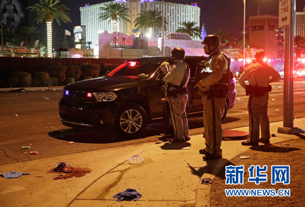 10月2日,在美國西部城市拉斯維加斯,警察在槍擊事件現(xiàn)場(chǎng)警戒。新華社/美聯(lián)