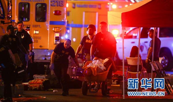 10月1日,在美國西部城市拉斯維加斯,工作人員在槍擊事件現(xiàn)場(chǎng)救治傷者。新華社/美聯(lián)