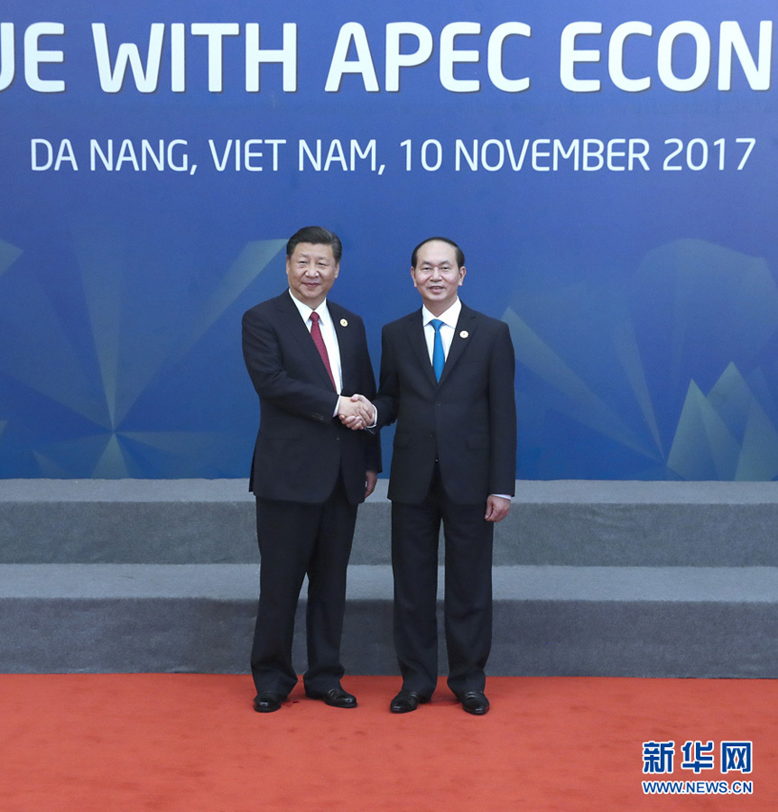 11月10日,國家主席習近平在越南峴港出席亞太經(jīng)合組織領(lǐng)導人同工商咨詢理事會代表對話會。這是對話會開始前,習近平受到越南國家主席陳大光的迎接。新華社記者 馬占成 攝