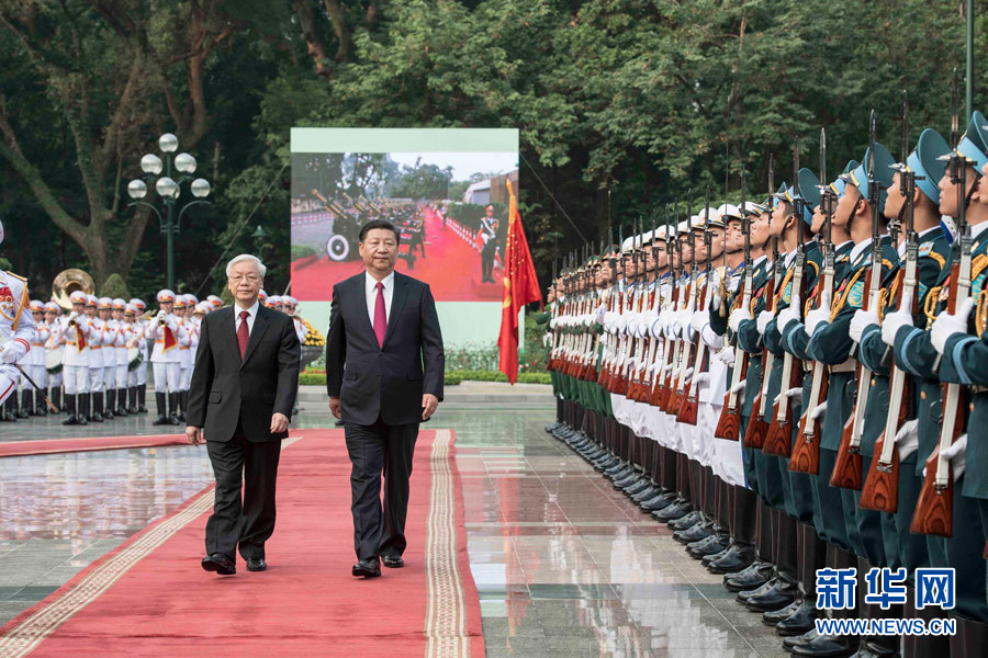 11月12日,中共中央總書(shū)記、國(guó)家主席習(xí)近平在河內(nèi)越共中央駐地同越共中央總書(shū)記阮富仲舉行會(huì)談。這是會(huì)談前,阮富仲在主席府廣場(chǎng)為習(xí)近平舉行盛大歡迎儀式。 新華社記者 李濤 攝