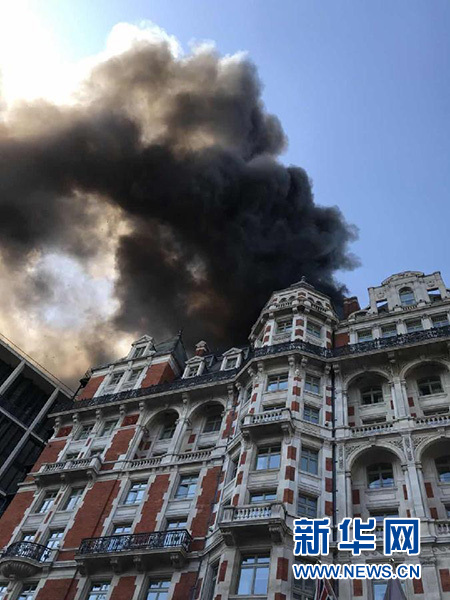 這是6月6日在英國(guó)倫敦騎士橋附近拍攝的起火的文華東方酒店。新華社發(fā)(鄧漢聲攝)