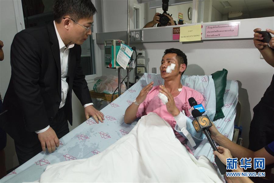 月7日,在泰國(guó)普吉,中國(guó)駐泰國(guó)大使呂?。ㄖ校┪繂?wèn)受傷中國(guó)游客。中國(guó)政府聯(lián)合工作組7日前往普吉行政醫(yī)院,看望在5日普吉游船傾覆事故中受傷的中國(guó)同胞及家屬。2018-07-07 15:25:16