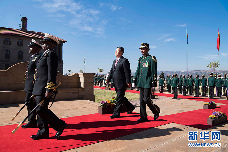 總統(tǒng)府前廣場,微風拂面,陽光和煦。中南兩國國旗迎風飄揚。習近平和夫人彭麗媛受到拉馬福薩和夫人莫采佩熱情迎接。兩國元首夫婦登上檢閱臺。儀仗隊行持槍禮。軍樂隊奏中國國歌?,F(xiàn)場鳴放21響禮炮。習近平檢閱儀仗隊。軍樂隊奏南非國歌。習近平和彭麗媛同南方主要官員握手。拉馬福薩夫婦同中方陪同人員握手。兩國元首夫婦親切寒暄。拉馬福薩對習近平在南中建交20周年之際訪問南非并出席金磚國家領(lǐng)導人會晤表示熱烈歡迎。