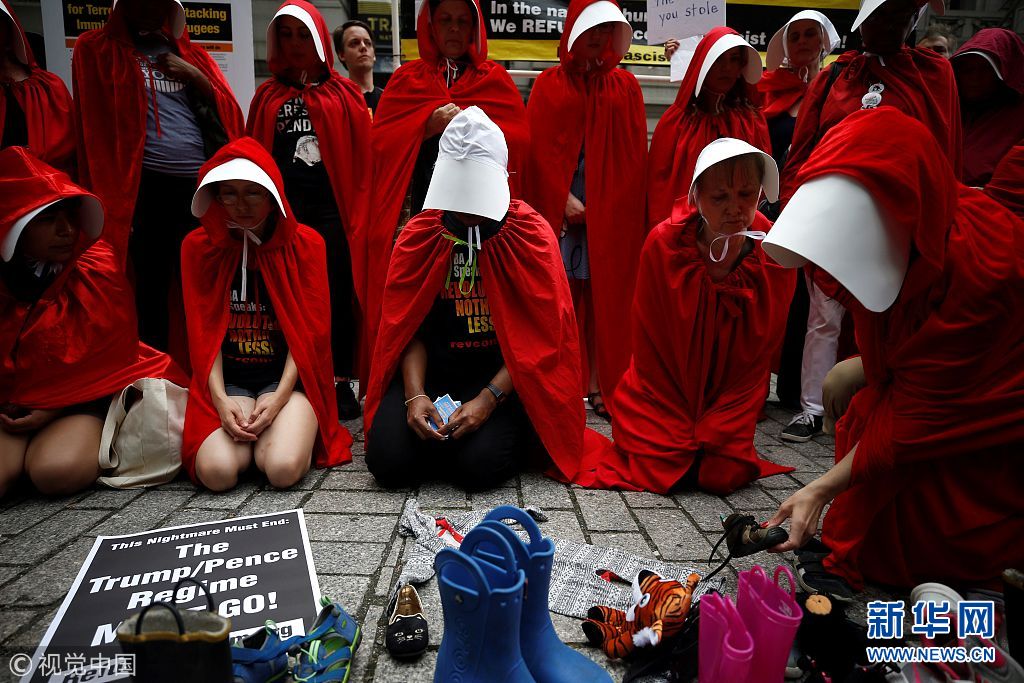 當?shù)貢r間2018年7月31日,美國紐約,女性示威者扮成美劇《使女的故事》中的“使女”在亞歷山大·漢密爾頓海關(guān)大樓前示威,抗議美國總統(tǒng)特朗普和副總統(tǒng)麥克·彭斯。她們手持鞋子,代表被迫與父母分離的移民兒童。(圖片來源:視覺中國)