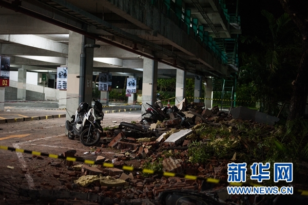 8月5日,在印度尼西亞西努沙登加拉省龍目島以西的巴厘島,一名安保人員查看一處停車場里的落石。 新華社發(fā)(穆罕默德·福齊·哈尼亞戈攝)