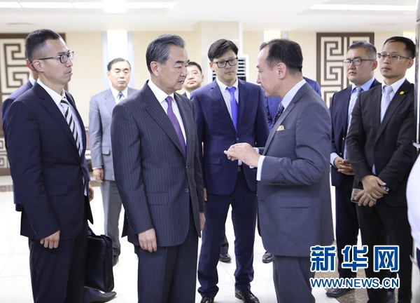 8月25日,在蒙古國(guó)首都烏蘭巴托,中國(guó)國(guó)務(wù)委員兼外交部長(zhǎng)王毅(前中)在蒙古國(guó)外長(zhǎng)朝格特巴特爾(前右)的陪同下專(zhuān)程來(lái)到烏蘭巴托成吉思汗國(guó)際機(jī)場(chǎng)考察“一帶一路”快速通道并現(xiàn)場(chǎng)了解情況。 新華社記者阿斯鋼攝