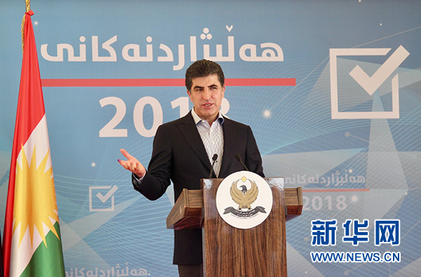 9月30日,伊拉克庫(kù)爾德自治區(qū)(庫(kù)區(qū))政府總理內(nèi)奇爾萬(wàn)·巴爾扎尼在埃爾比勒市投票后出席新聞發(fā)布會(huì)。 新華社發(fā)(亞瑟爾·賈瓦德 攝)