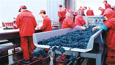 圖為摩洛哥一家酒莊的工人對葡萄進(jìn)行清洗加工準(zhǔn)備釀酒。葡萄酒將借首屆國際進(jìn)博會來到中國。新華社記者 陳斌杰攝