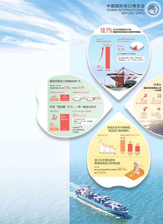 中國長期堅持?jǐn)U大進(jìn)口,尤其是黨的十八大以來,明確提出主動擴(kuò)大進(jìn)口,并取得明顯成效。從貨物貿(mào)易來看,1978年到2017年,按人民幣計價,我國進(jìn)口總額從187億元提高到12.5萬億元,年均增速為18.1%。服務(wù)貿(mào)易進(jìn)口方面,1982年到2017年,我國服務(wù)貿(mào)易進(jìn)口增長230倍,年均增長16.8%。