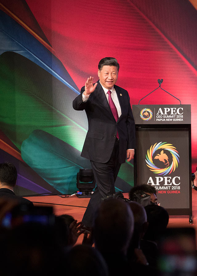 11月17日,國(guó)家主席習(xí)近平應(yīng)邀出席在巴布亞新幾內(nèi)亞莫爾茲比港舉行的亞太經(jīng)合組織工商領(lǐng)導(dǎo)人峰會(huì)并發(fā)表題為《同舟共濟(jì)創(chuàng)造美好未來》的主旨演講。新華社記者 鞠鵬 攝
