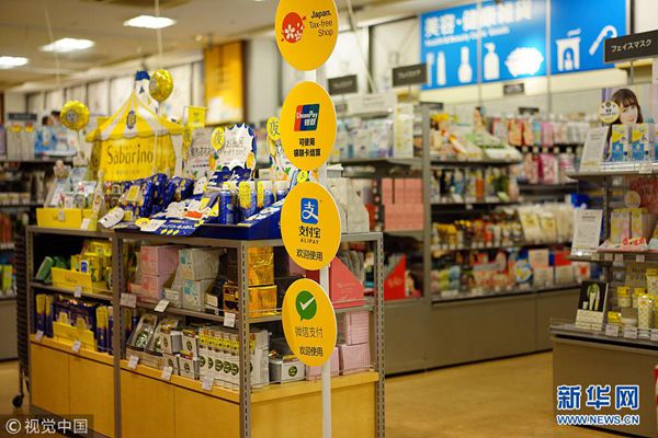 7月14日,日本大阪的某商場(chǎng),幾乎每一個(gè)專(zhuān)柜前都立有中國(guó)移動(dòng)支付的提示牌。(圖片來(lái)源:視覺(jué)中國(guó))