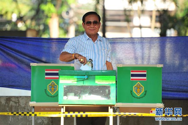 3月24日,泰國總理巴育在曼谷一個(gè)投票站投票。 泰國2014年軍事政變后的首次大選24日拉開帷幕,選舉委員會(huì)預(yù)計(jì)全國80%的選民將參加投票。正式結(jié)果將于5月9日前公布。 新華社發(fā)(拉亨 攝)