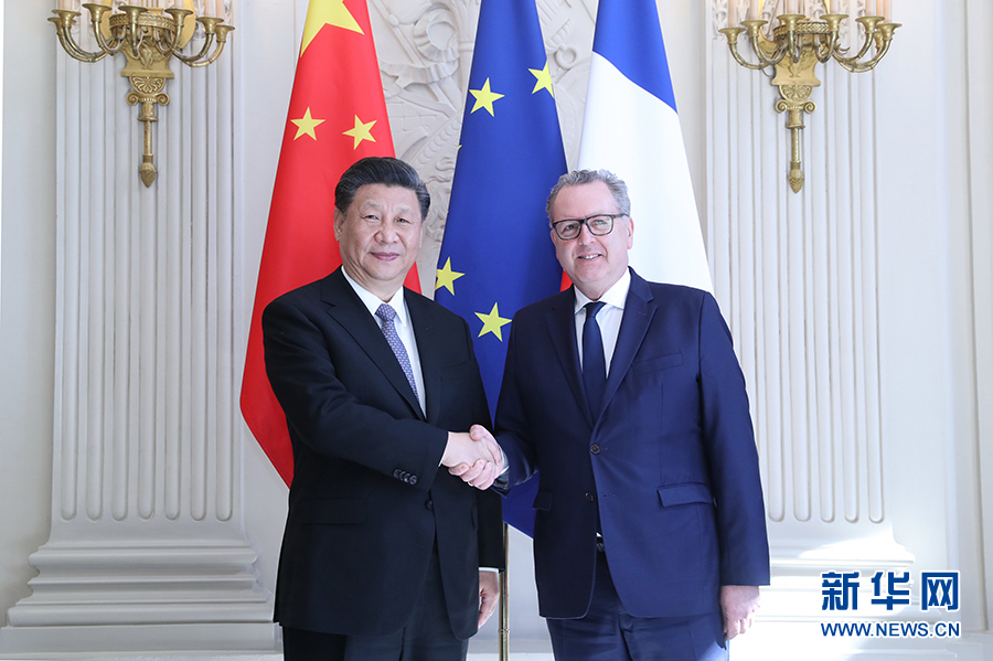 3月26日,國(guó)家主席習(xí)近平在巴黎會(huì)見(jiàn)法國(guó)國(guó)民議會(huì)議長(zhǎng)費(fèi)朗。 新華社記者 鞠鵬 攝