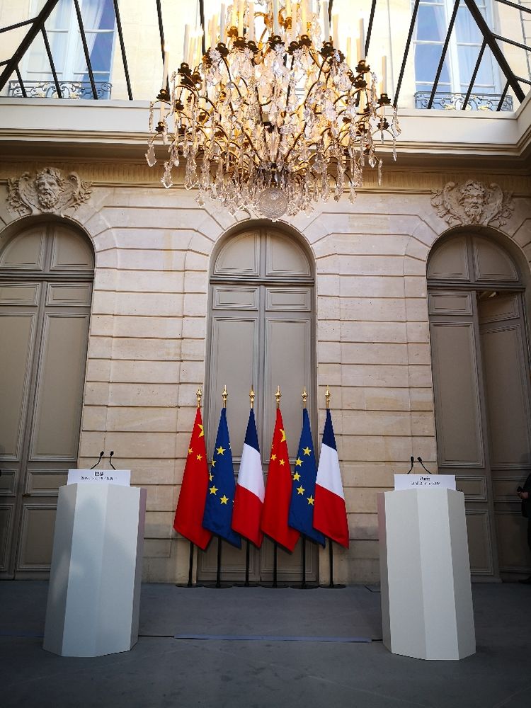 3月25日,這是兩國元首在愛麗舍宮共同會見記者前的場景。中國國旗、歐盟旗幟、法國國旗間隔排列。新華社記者 霍小光 攝