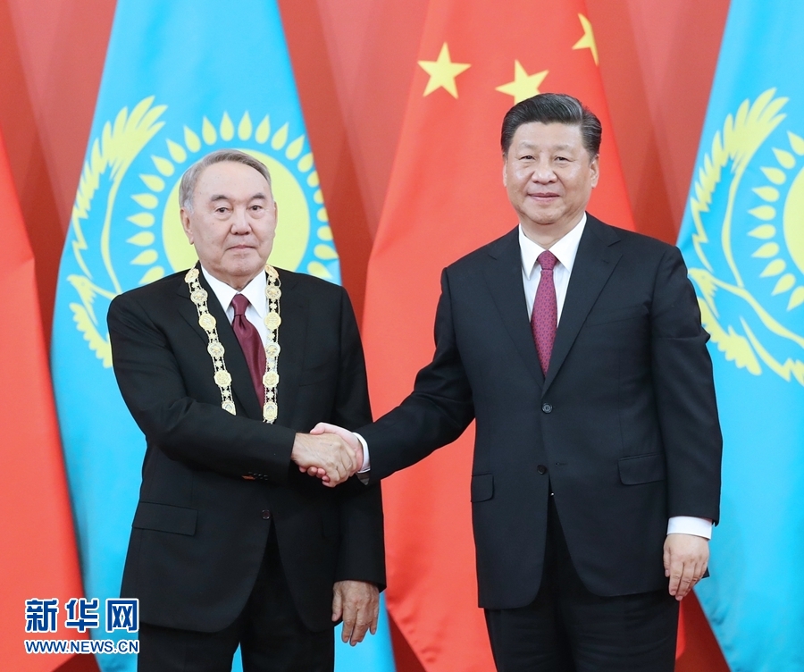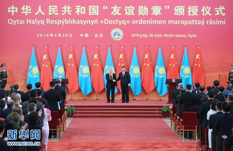 納扎爾巴耶夫致答辭。納扎爾巴耶夫表示,非常感謝習(xí)近平主席今天向我頒授中華人民共和國“友誼勛章”,這對我是無上榮譽。這枚勛章反映了中方對我致力于推進哈中全面戰(zhàn)略伙伴關(guān)系努力的高度認可。哈中在相互尊重和相互信任基礎(chǔ)上建立起的友好關(guān)系已經(jīng)成為國與國關(guān)系的典范,兩國間沒有任何未決問題。我同中國領(lǐng)導(dǎo)人之間的深厚友誼和互信將永遠留在我心里。我衷心祝賀中國成功舉辦第二屆“一帶一路”國際合作高峰論壇。習(xí)近平主席提出的“一帶一路”倡議,已經(jīng)成為成功的國際合作平臺,不僅推動了亞歐大陸的共同發(fā)展,也促進了世界的和平與繁榮。在中華人民共和國成立70周年之際,我衷心祝愿中國人民在以習(xí)近平同志為核心的中國共產(chǎn)黨領(lǐng)導(dǎo)下,順利實現(xiàn)中華民族偉大復(fù)興的中國夢。中國的發(fā)展繁榮對世界是重大利好。