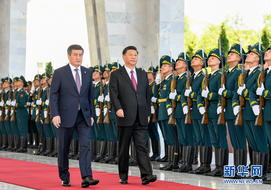 6月13日,國家主席習(xí)近平在比什凱克同吉爾吉斯斯坦總統(tǒng)熱恩別科夫會談。會談前,熱恩別科夫在阿拉爾恰國賓館會議中心前廣場為習(xí)近平舉行隆重歡迎儀式。這是兩國元首檢閱儀仗隊。 新華社記者 高潔 攝