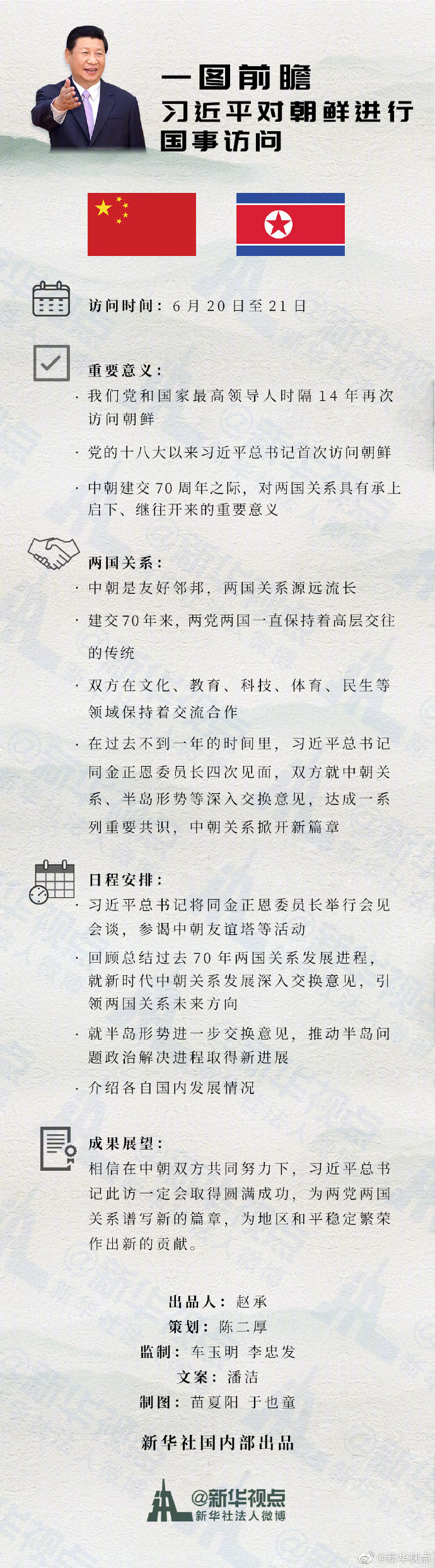 新華社北京6月17日電 中共中央對外聯(lián)絡(luò)部發(fā)言人胡兆明17日在北京宣布:應(yīng)朝鮮勞動黨委員長、朝鮮民主主義人民共和國國務(wù)委員會委員長金正恩邀請,中共中央總書記、中華人民共和國主席習(xí)近平將于6月20日至21日對朝鮮民主主義人民共和國進(jìn)行國事訪問。