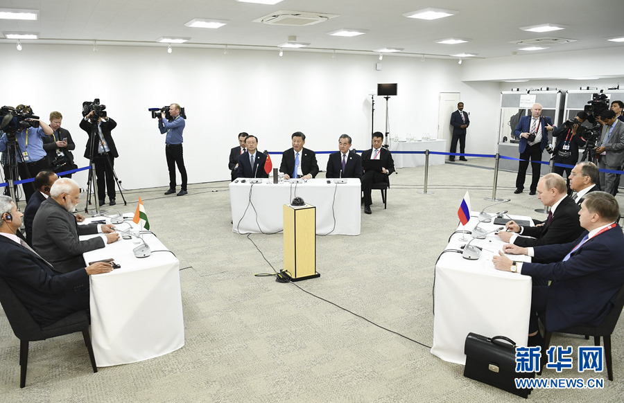 6月28日,國家主席習近平在大阪出席中俄印領(lǐng)導人會晤,同俄羅斯總統(tǒng)普京、印度總理莫迪就當前國際形勢、重大國際和地區(qū)問題、三方合作深入交換意見。新華社記者 謝環(huán)馳 攝