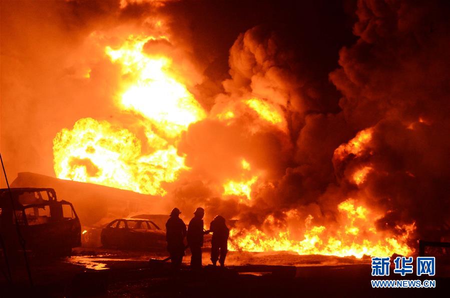 這是7月4日在尼日利亞拉各斯拍攝的輸油管道爆炸起火事故現(xiàn)場。新華社/尼通社