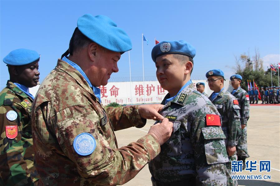 4月3日,在位于黎巴嫩南部辛尼亞村的中國(guó)維和部隊(duì)營(yíng)區(qū)舉行的授勛儀式上,聯(lián)黎部隊(duì)司令德?tīng)柨茽枺ㄇ白螅楣俦砼宕鲃渍?。新華社發(fā)