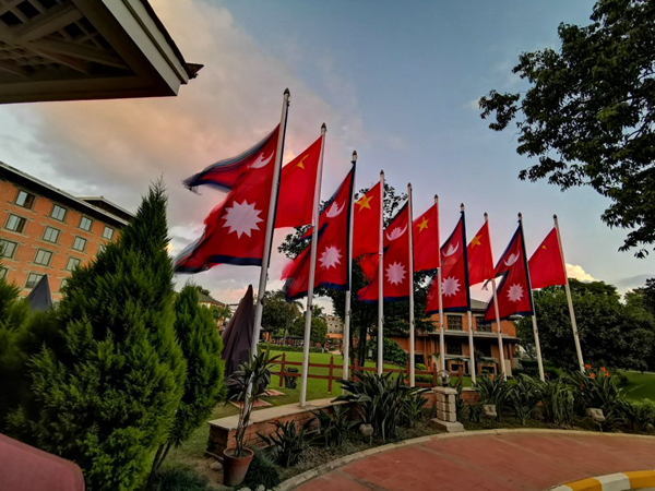 習(xí)近平主席在加德滿都下榻的飯店院內(nèi)飄揚(yáng)著中尼兩國(guó)國(guó)旗。新華社記者賴向東攝