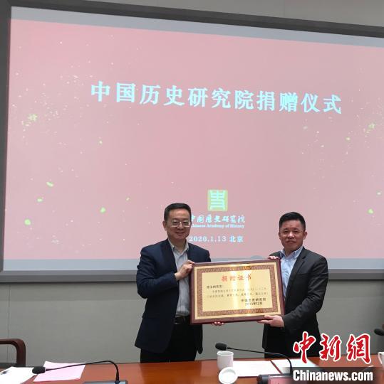 中國社科院副院長、黨組成員,中國歷史研究院院長、黨委書記高翔為陳玉樹頒發(fā)捐贈證書?!∪轿木辍z