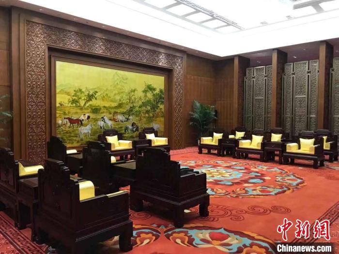 陳玉樹介紹,《松風(fēng)》的創(chuàng)作靈感源自宮廷舊藏——乾隆時期紫檀嵌玉寶座。作品采用世界名貴木材和純手工雕刻工藝,其椅面寬大,直靠背,搭腦后延似卷書狀,上雕蝙蝠銅錢周邊輔以拐子龍圖樣,寓意“福壽雙全”。扶手兩側(cè)均刻以松枝寓長青不老、堅韌忠貞之意??勘嘲逡愿叱摹敖z翎檀雕”工藝雕以“松鶴延年圖”。后背板更雕以“五福捧壽”圖樣,前后呼應(yīng),福壽雙至。座面下打洼束腰,拐子紋飾直牙條,方腿直下,半部略呈鼓腿后順沿而下外翻祥云紋馬蹄足。整套造型體量寬大,紋飾繁復(fù),具有典型的清式家具特色。