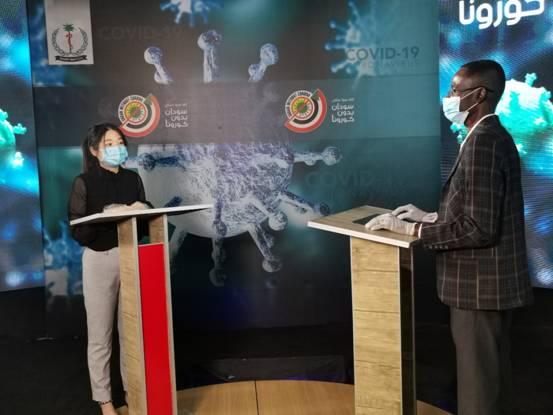 4月2日,中國(guó)第35批援蘇丹醫(yī)療隊(duì)隊(duì)員鄭喜在蘇丹國(guó)家新冠肺炎防控中心演播廳接受采訪并錄制視頻。(圖片由醫(yī)療隊(duì)提供)