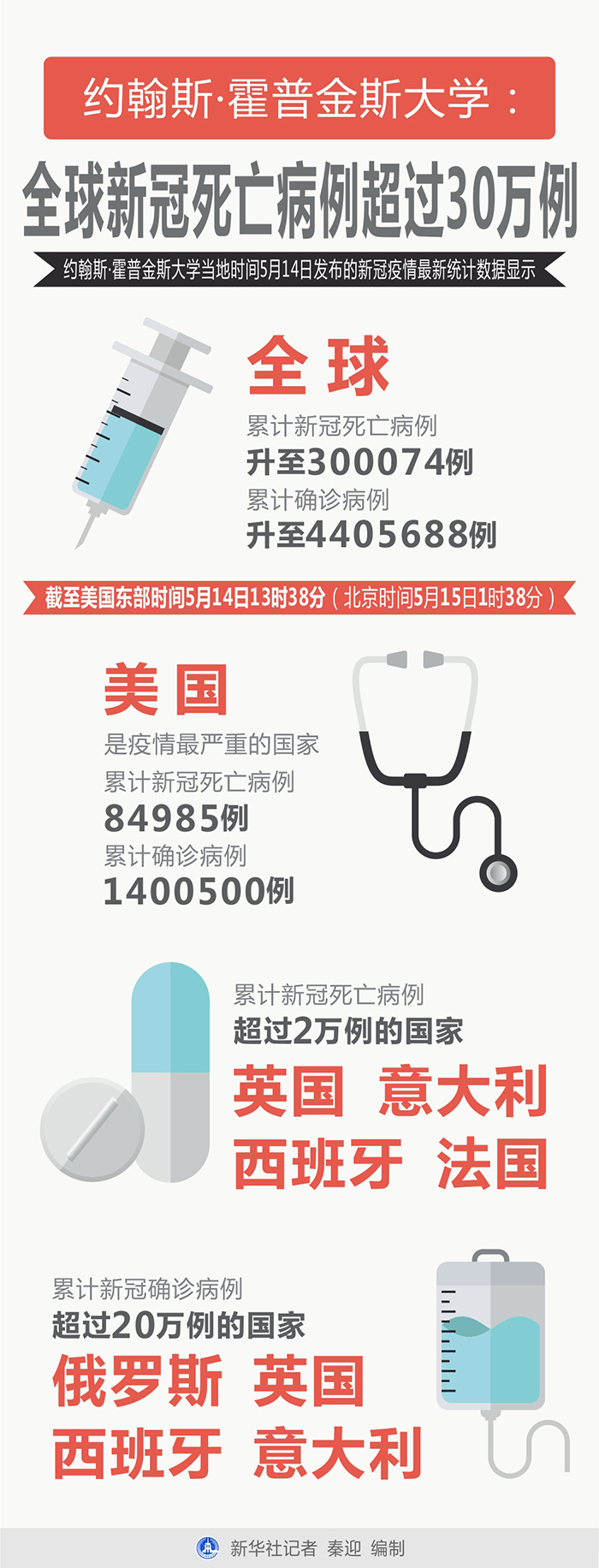 新華社北京5月15日電 ?14日全球疫情簡(jiǎn)報(bào):美研究機(jī)構(gòu)統(tǒng)計(jì)美國(guó)新冠確診超140萬(wàn) 全球病亡超30萬(wàn)