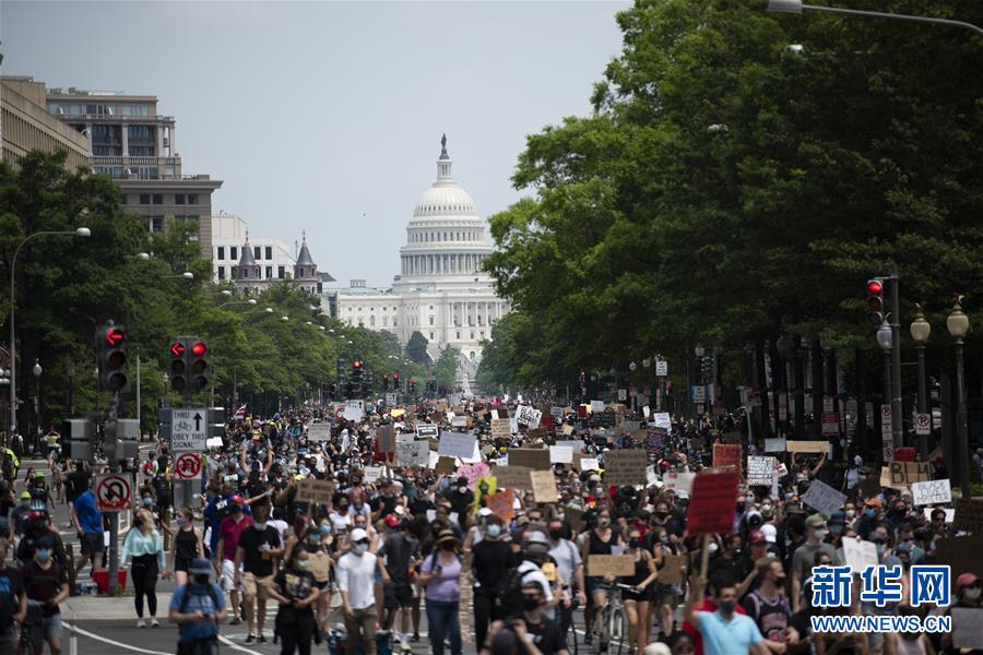 6月6日,人們在美國華盛頓國會附近游行。美國首都迎來了十幾天來參與人數(shù)最多的游行活動。新華社記者 劉杰 攝