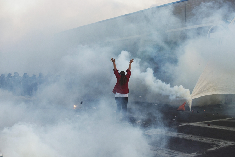 5月30日晚,在美國明尼蘇達(dá)州明尼阿波利斯市,抗議者在防暴警察施放的催淚瓦斯中與警察對峙。新華社發(fā)(安格斯·亞歷山大攝)