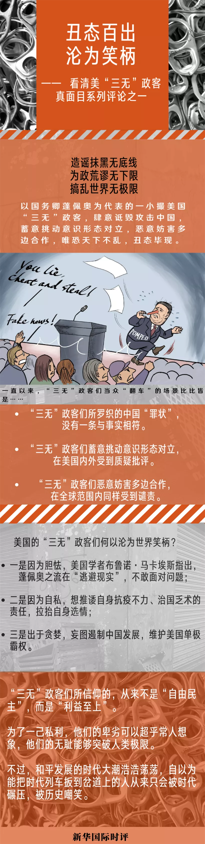 一段時間以來,以國務(wù)卿蓬佩奧為代表的一小撮造謠抹黑無底線、為政荒謬無下限、搞亂世界無極限的美國“三無”政客,肆意詆毀攻擊中國,蓄意挑動意識形態(tài)對立,惡意妨害多邊合作,唯恐天下不亂,丑態(tài)畢現(xiàn)。