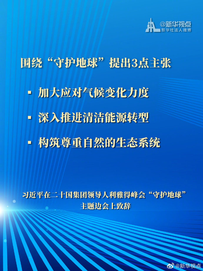 國家主席習(xí)近平11月22日在二十國集團(tuán)領(lǐng)導(dǎo)人利雅得峰會“守護(hù)地球”主題邊會上提出3點主張。