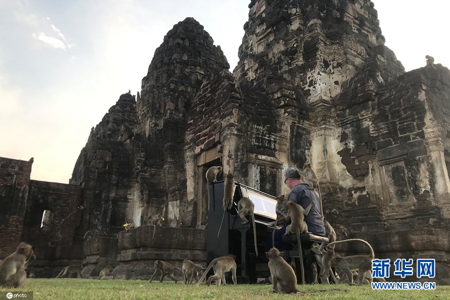 11月21日,泰國華富里府,英國鋼琴家保羅·巴頓(Paul Barton)為一群猴子彈鋼琴。演奏過程中,多只猴子在他周圍跑來跑去,有幾只還爬上了鋼琴,甚至在他的頭頂跳來跳去。巴頓稱,這場特殊的音樂會旨在引起人們對這群饑餓的猴子的重視。(圖片來源:東方IC)