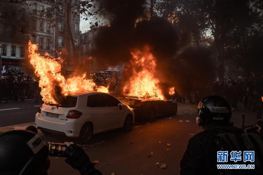 這是11月28日在法國(guó)巴黎拍攝的游行示威中被點(diǎn)燃的車(chē)輛。