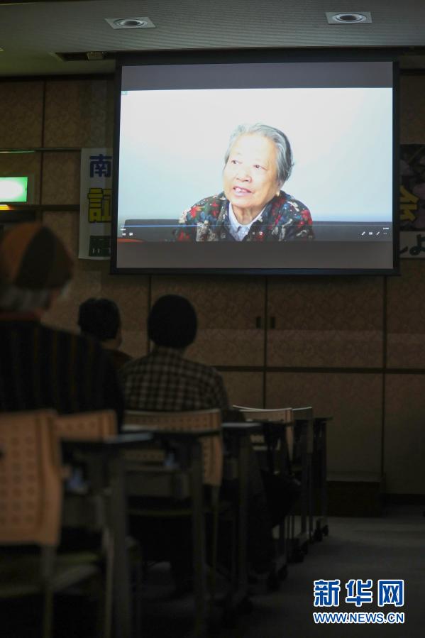 12月13日,人們?cè)谌毡緰|京舉行的紀(jì)念南京大屠殺83周年集會(huì)現(xiàn)場(chǎng)觀看南京大屠殺幸存者石秀英的講述紀(jì)錄片。新華社記者 杜瀟逸 攝