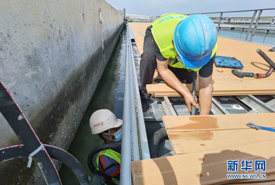 12月16日,在馬爾代夫馬累,機(jī)電施工人員在維拉納國際機(jī)場水飛航站樓水飛浮碼頭進(jìn)行管線調(diào)修。新華社發(fā)(北京城建集團(tuán)供圖)